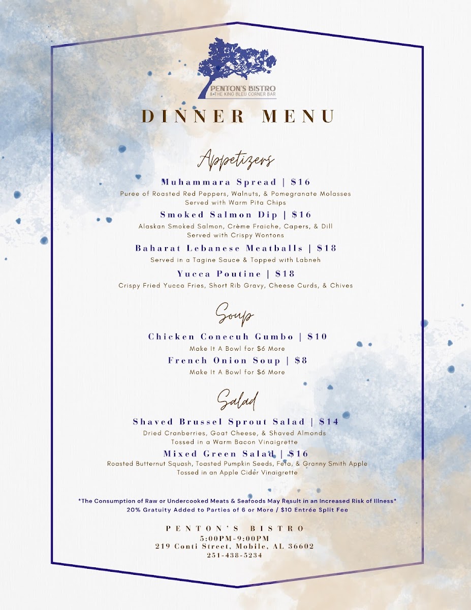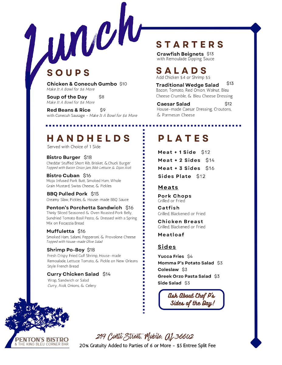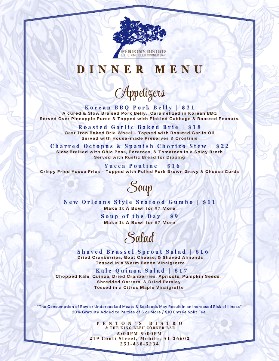 In conclusion, the menu at Penton’s Bistro & The King Bleu Corner Bar is a delightful mix of Southern-inspired dishes, fresh salads, hearty plates, and satisfying sandwiches, all at affordable prices. Whether you're dining in for a casual lunch or a more substantial dinner, there's something on the menu that will surely leave you satisfied.