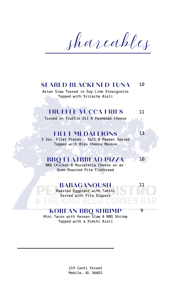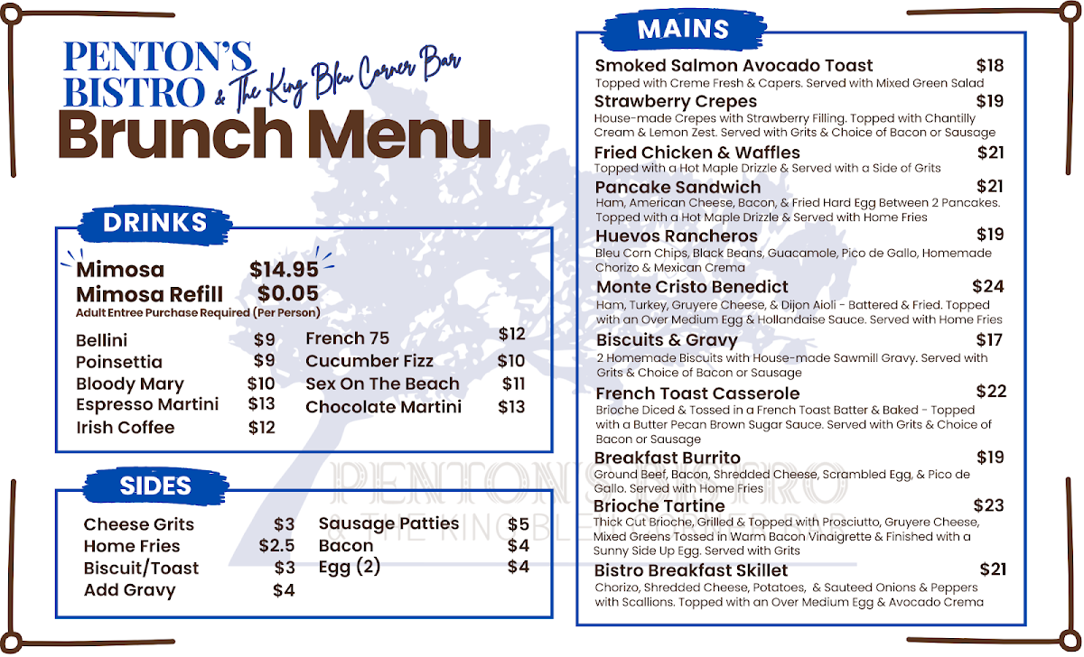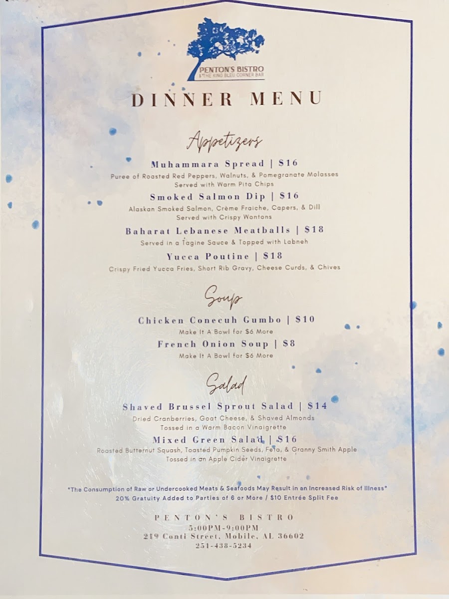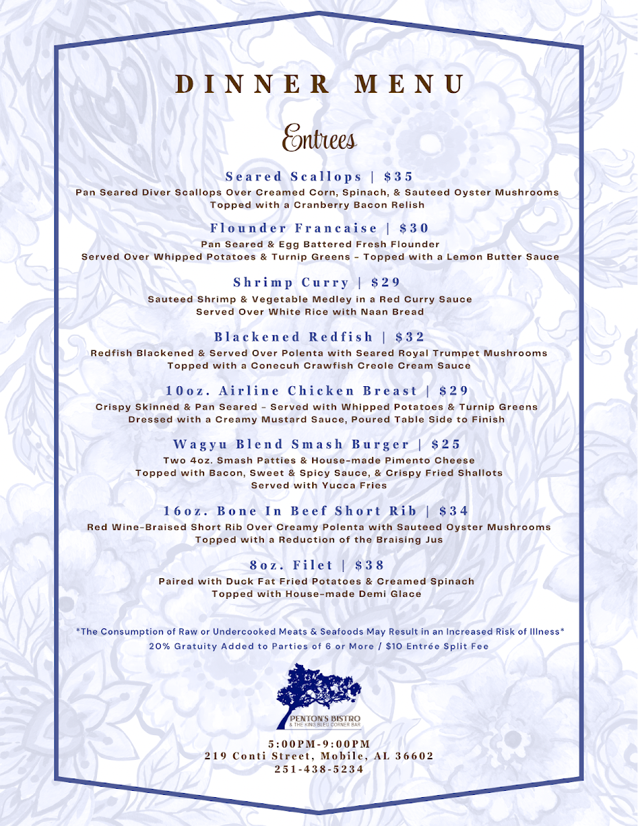 In conclusion, the menu at Penton’s Bistro & The King Bleu Corner Bar is a delightful mix of Southern-inspired dishes, fresh salads, hearty plates, and satisfying sandwiches, all at affordable prices. Whether you're dining in for a casual lunch or a more substantial dinner, there's something on the menu that will surely leave you satisfied.