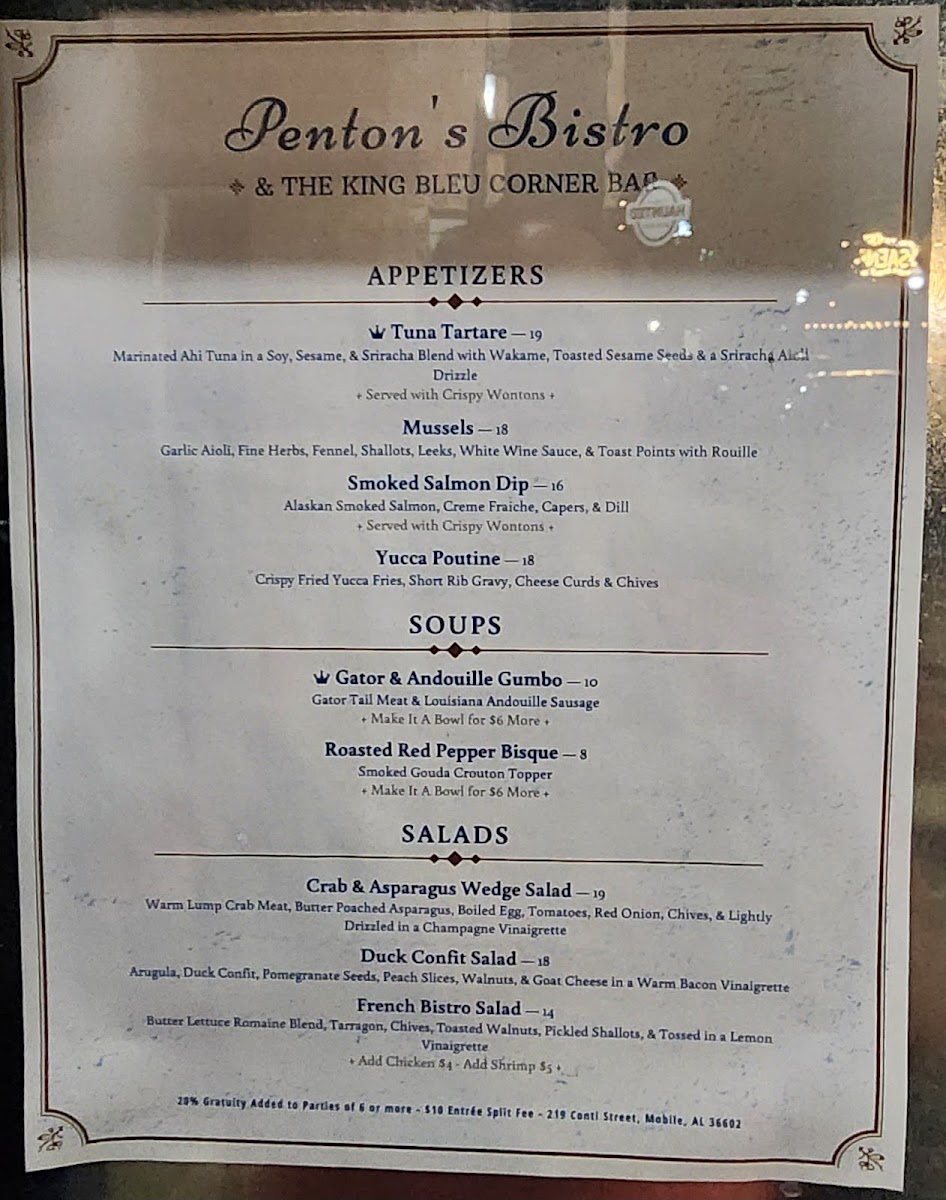 Penton’s Bistro & The King Bleu Corner Bar, located at 219 Conti St, Mobile, AL, offers a well-rounded menu that caters to a variety of tastes, making it a great choice for anyone seeking a satisfying meal in a casual yet vibrant setting. The salads on the menu provide a refreshing start to any meal, with options like the classic Wedge Salad and the crisp Crispy Caesar Salad, each offering a perfect balance of flavors.